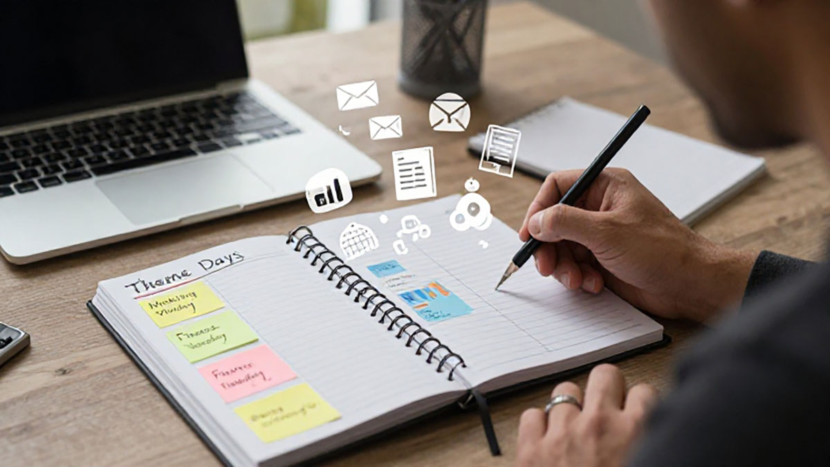 “Theme Days” adalah teknik manajemen waktu yang memperbolehkan Anda mengelompokkan pekerjaan berdasarkan kategori atau tema tertentu. Misalnya, hari Senin bisa difokuskan untuk perencanaan dan strategi, Selasa untuk rapat dan komunikasi, Rabu untuk pengembangan proyek, dan seterusnya. Dengan pendekatan ini, otak tidak dipaksa untuk sering berpindah konteks, yang biasanya menjadi sumber kelelahan mental dan produktivitas menurun.